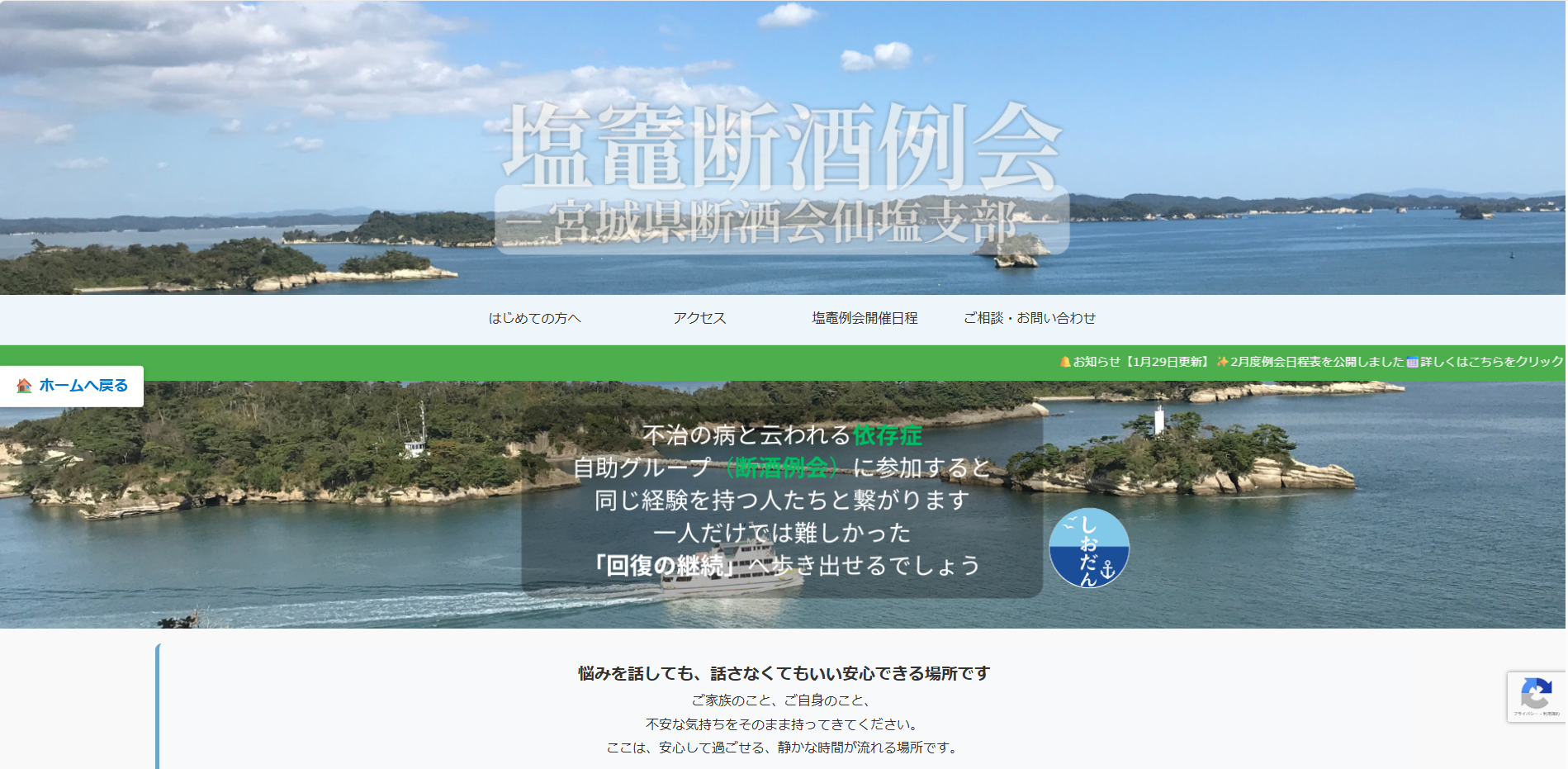 塩竈断酒例会様(https://shio-dan.com/)の公式Webサイトにおいて、新規立ち上げからコンテンツ制作、日々の運用までを一貫して担当しております。